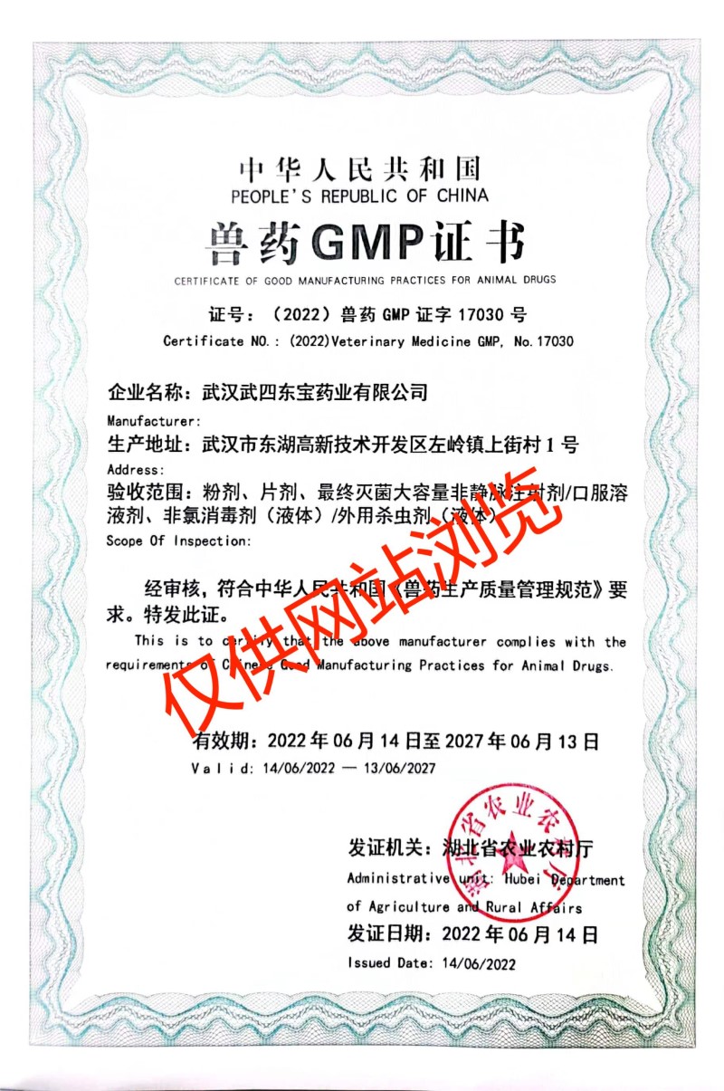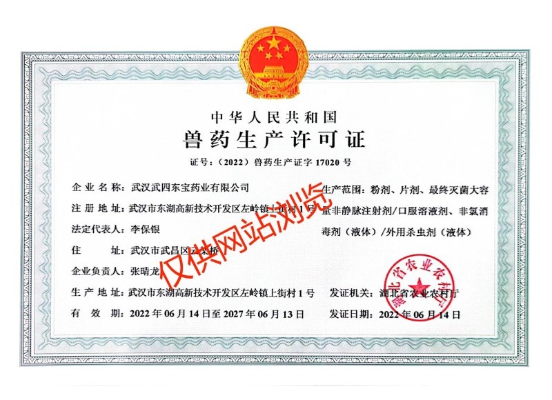 武漢武四東寶藥業(yè)有限公司,是在原武昌獸藥廠(成立于1972年)基礎(chǔ)上發(fā)展而來,公司位于武漢市東湖新技術(shù)開發(fā)區(qū)左嶺工業(yè)園,是一家專業(yè)從事動(dòng)物保健品的研發(fā)、生產(chǎn)、銷售和服務(wù)于一體的高新技術(shù)企業(yè),目前擁有六條生產(chǎn)線、十種劑型(最終滅菌小容量注射劑、最終滅菌大容量非靜脈注射劑、口服溶液劑、粉劑、預(yù)混劑、固體殺蟲劑、液體殺蟲劑、片劑、顆粒劑、液體消毒劑)。公司成立于2004年,2006年全面通過國(guó)家農(nóng)業(yè)部獸藥GMP認(rèn)證,已成為中國(guó)獸用保健行業(yè)知名企業(yè)之一。武漢武四東寶藥業(yè)有限公司自創(chuàng)建以來,一直秉承著“善、行、學(xué)、成”的核心價(jià)值觀,恪守“一切為了健康養(yǎng)殖”的企業(yè)使命,堅(jiān)持“科技成就價(jià)值,服務(wù)創(chuàng)造未來”的服務(wù)理念,經(jīng)過多年不斷的創(chuàng)新與發(fā)展,逐步形成了自己的核心競(jìng)爭(zhēng)力,并在行業(yè)中脫穎而出。公司與中國(guó)農(nóng)業(yè)大學(xué)、華中農(nóng)業(yè)大學(xué)、武漢工程大學(xué)、武漢工業(yè)學(xué)院、中科院水生所等全國(guó)知名院校和科研院所建立了長(zhǎng)期密切的合作關(guān)系,通過聯(lián)合攻關(guān)和技術(shù)引進(jìn)等方式,研發(fā)出50多種優(yōu)質(zhì)、高效、穩(wěn)定的產(chǎn)品,并深得廣大用戶的認(rèn)可與信賴。公司以“追求健康的用戶群體和卓越市場(chǎng)占有率”為經(jīng)營(yíng)理念,堅(jiān)持以市場(chǎng)為導(dǎo)向,強(qiáng)化科技創(chuàng)新,拓展產(chǎn)品結(jié)構(gòu),努力為我國(guó)健康養(yǎng)殖事業(yè)的發(fā)展作出更大的貢獻(xiàn)!